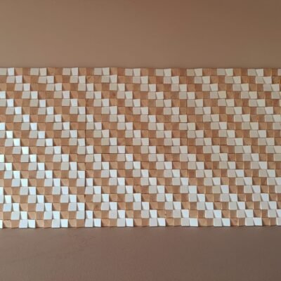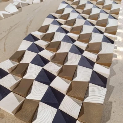 Mosaico de madera en color dorado, negro y natural