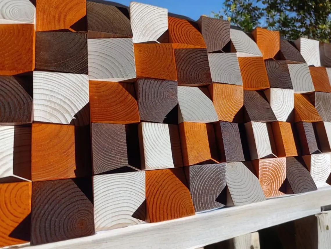 Mosaico de madera turquesa, blanca y natural