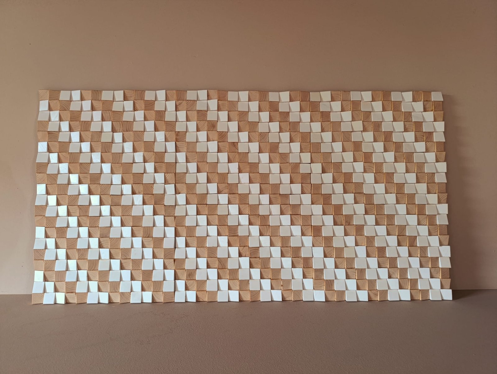 Mosaico de madera turquesa, blanca y natural